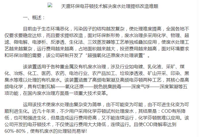 亞洲在線刊登:天盛環保電芬頓技術解決廢水處理提標改造難題