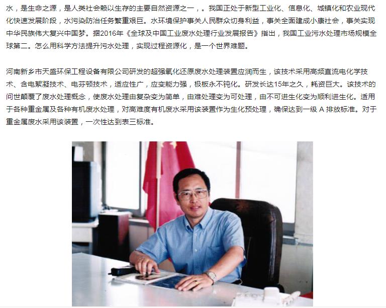 中國高新技術網發布:《關注:解碼科技創新》——新鄉市天盛環保“超強氧化還原廢水處理技術”